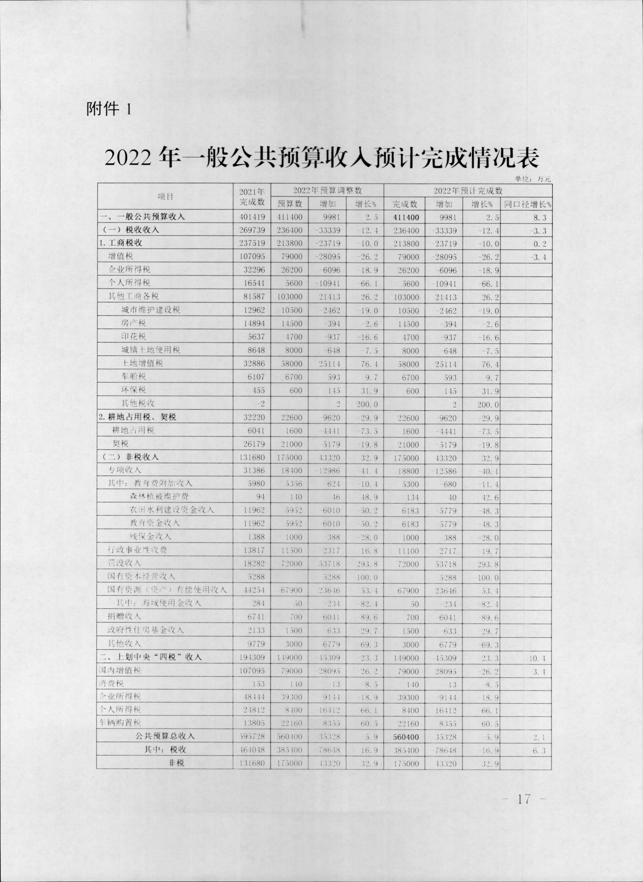 税收收入38.54亿元、下降16.9%。其中增值税15.8亿元、下降26.2%,企业所得税6.55亿元、下降18.9%,个人所得税1.4亿元、下降66.1%,其他工商各税14.79亿元、增长15.8%。税收降幅较大主要原因是留抵退税等减税降费政策影响,还原增值税留抵退税后,税收收入45.1亿元,其中增值税22.36亿元。