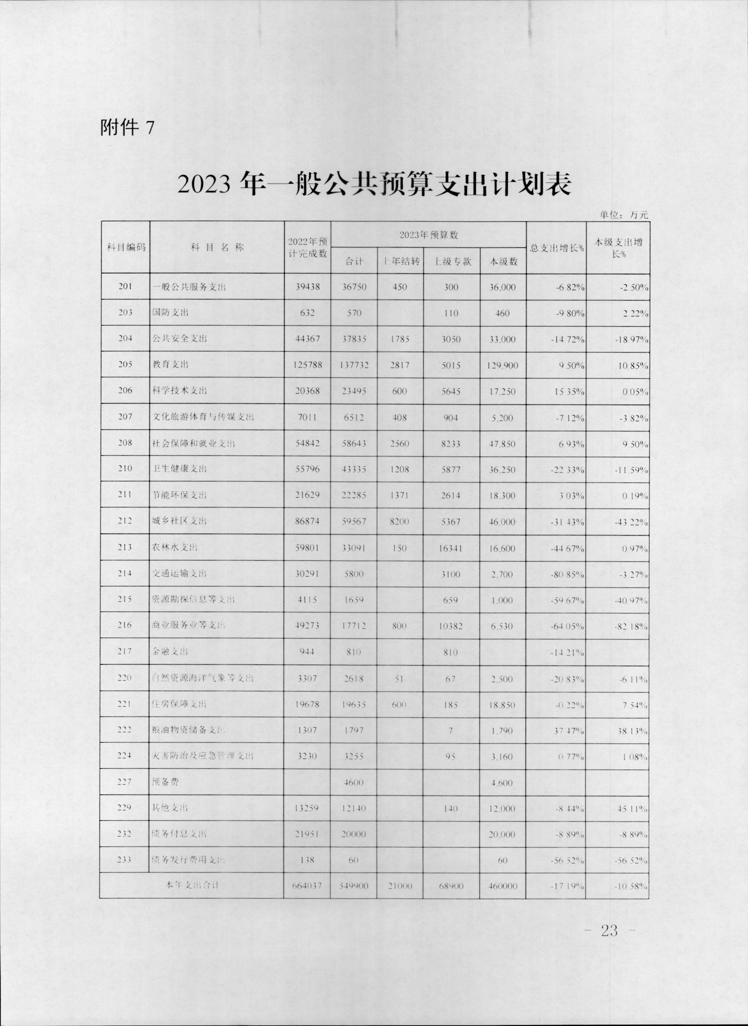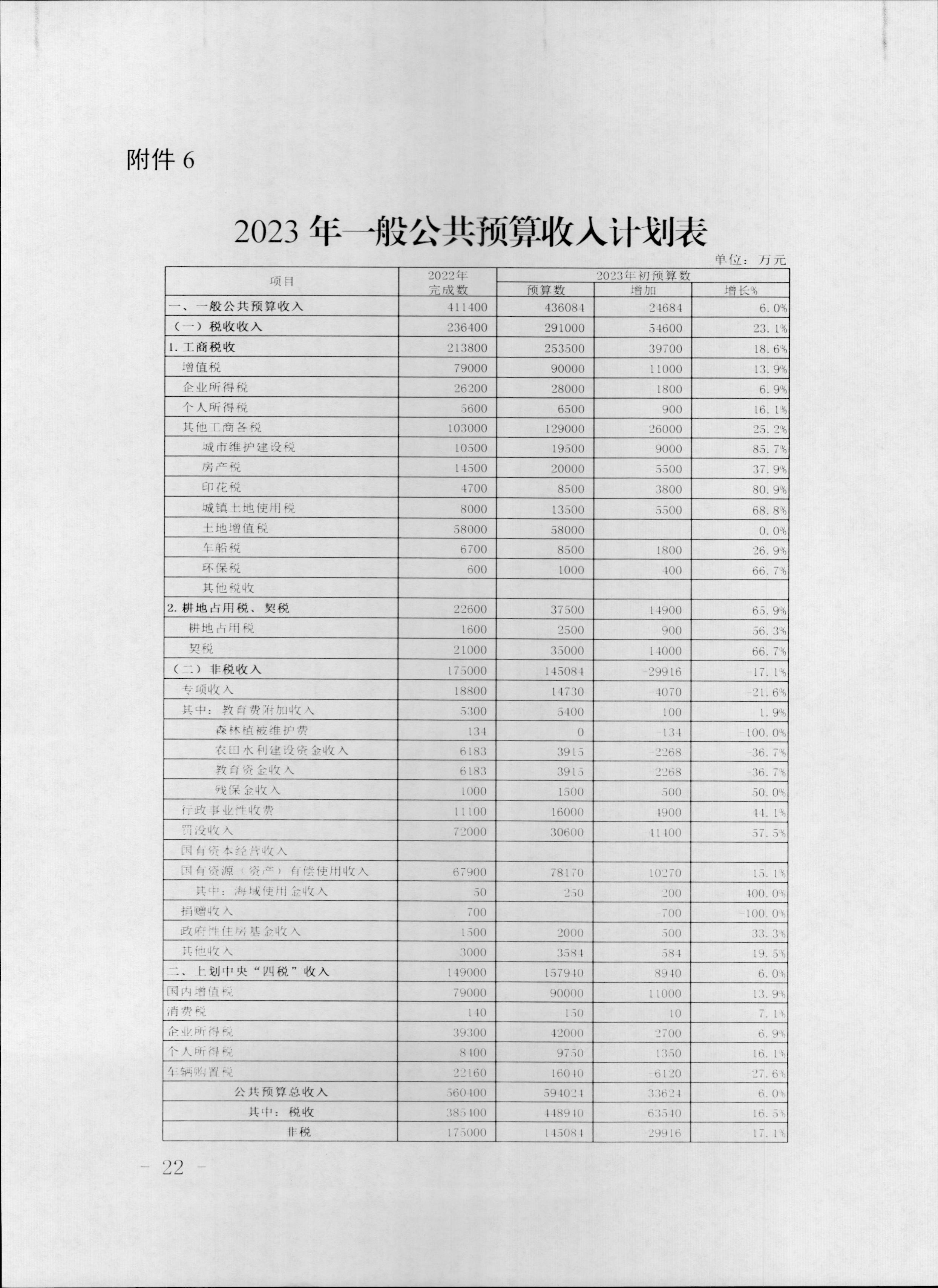 (1)收入预算安排。按照6%预期增长目标,2023年一般公共预算总收入59.4亿元。其中:税收收入44.89亿元,增收6.35亿元、增长16.5%;非税收入14.51亿元,减收2.99亿元、下降17.1%。一般公共预算收入43.61亿元,增收2.47亿元、增长6.0%。