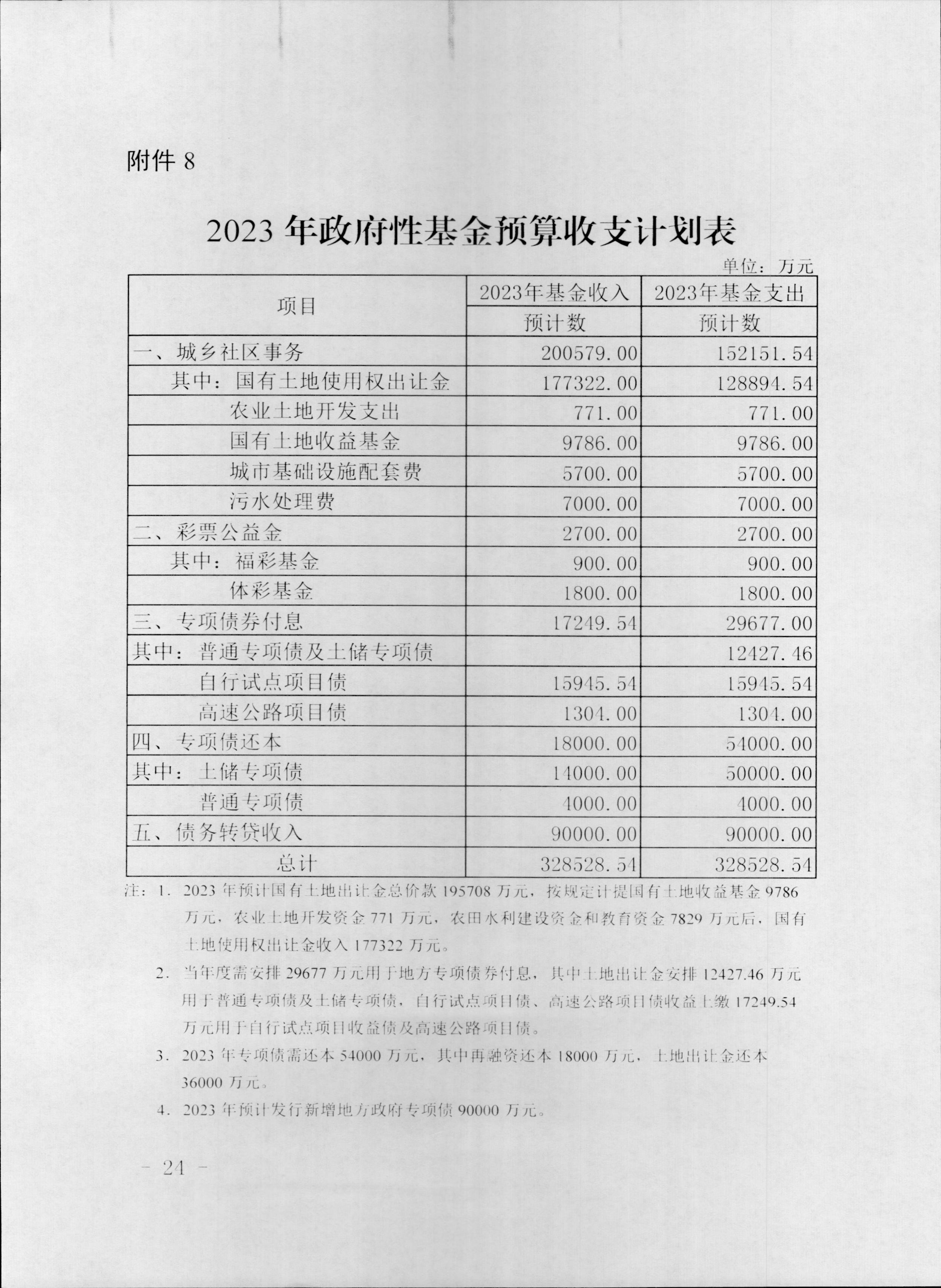 政府性基金收入32.85亿元,其中国有土地使用权出让金收入17.73亿元,专项债收入初步安排9亿元;政府性基金支出32.85亿元,实现收支平衡。2023年我市申报专项债项目22个、资金需求90.46亿元,项目资金需求待中央、省级额度批复后,再根据进度报市人大常委会进行预算调整。