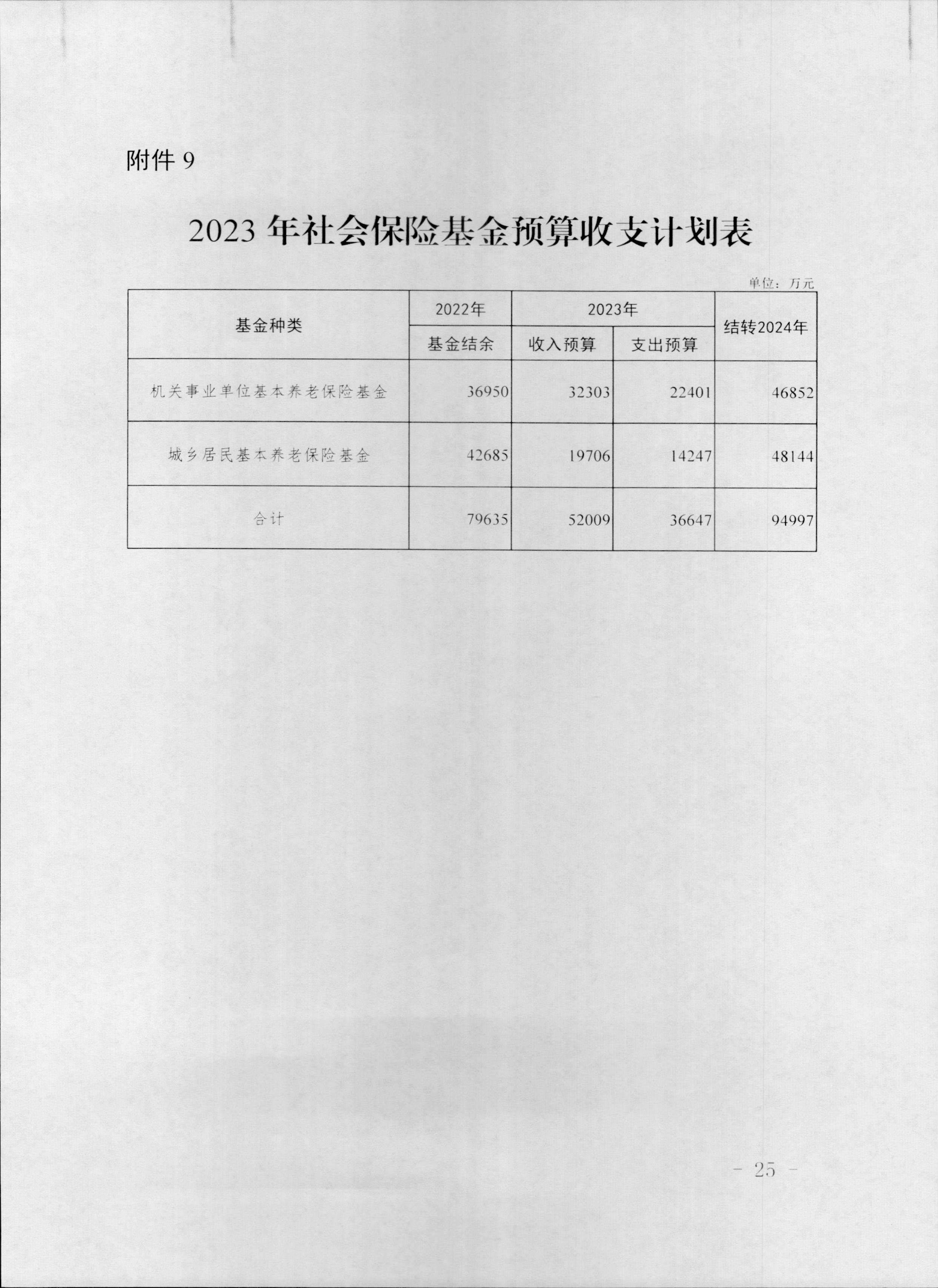 机关事业单位基本养老保险基金收入3.23亿元,上年结转3.69亿元,总收入6.92亿元;安排支出2.24亿元,结余4.68亿元。