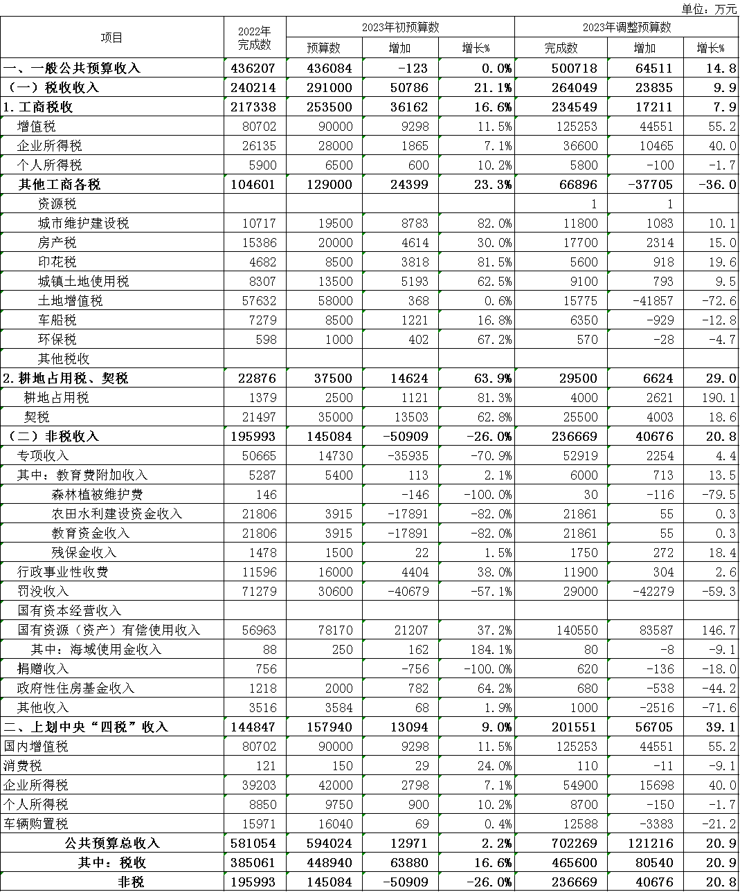 2023年公共财政预算收入调整情况表