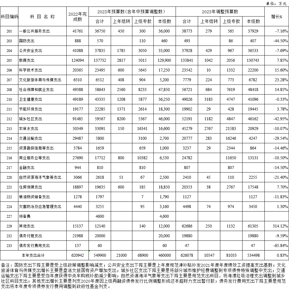 2023年公共财政预算支出调整情况表