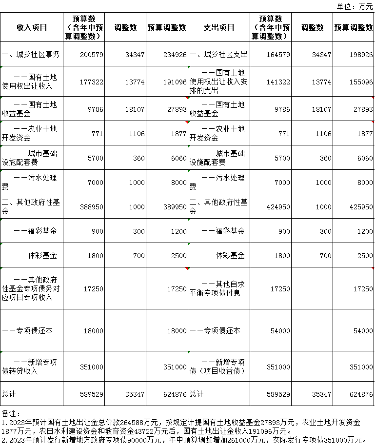 2023年政府性基金预算收支调整情况表