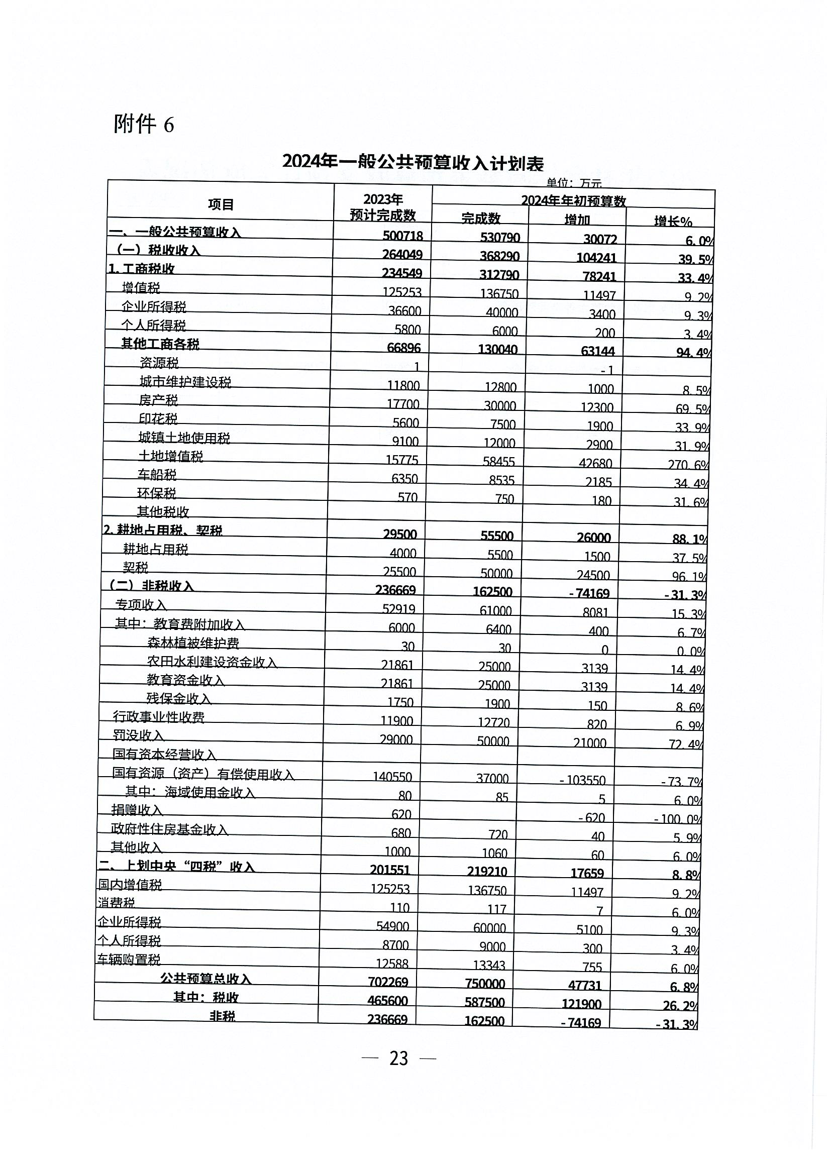 (1)收入预算安排。一般公共预算总收入75亿元,增收4.77亿元、增长6.8% ,其中税收收入58.75亿元、增长26.2%,非税收入16.25亿元、下降31.3%。一般公共预算收入53.08亿元,增收3.01亿元、增长6%。