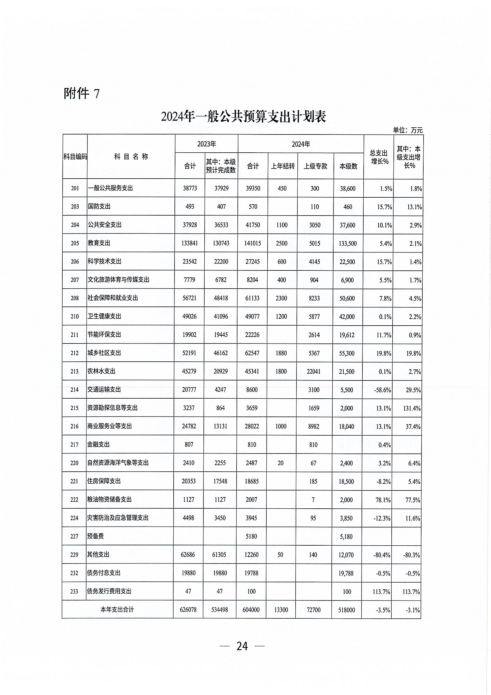 (2)支出预算安排。一般公共预算支出60.4亿元,下降3.5%,若扣除2023年列支往前年度一般债券还本4.87亿元,增长4.6%。其中:上年结转支出1.33亿元、上级专项补助支出7.27亿元、本级财力支出51.8亿元。我市预算安排主要科目情况如下: