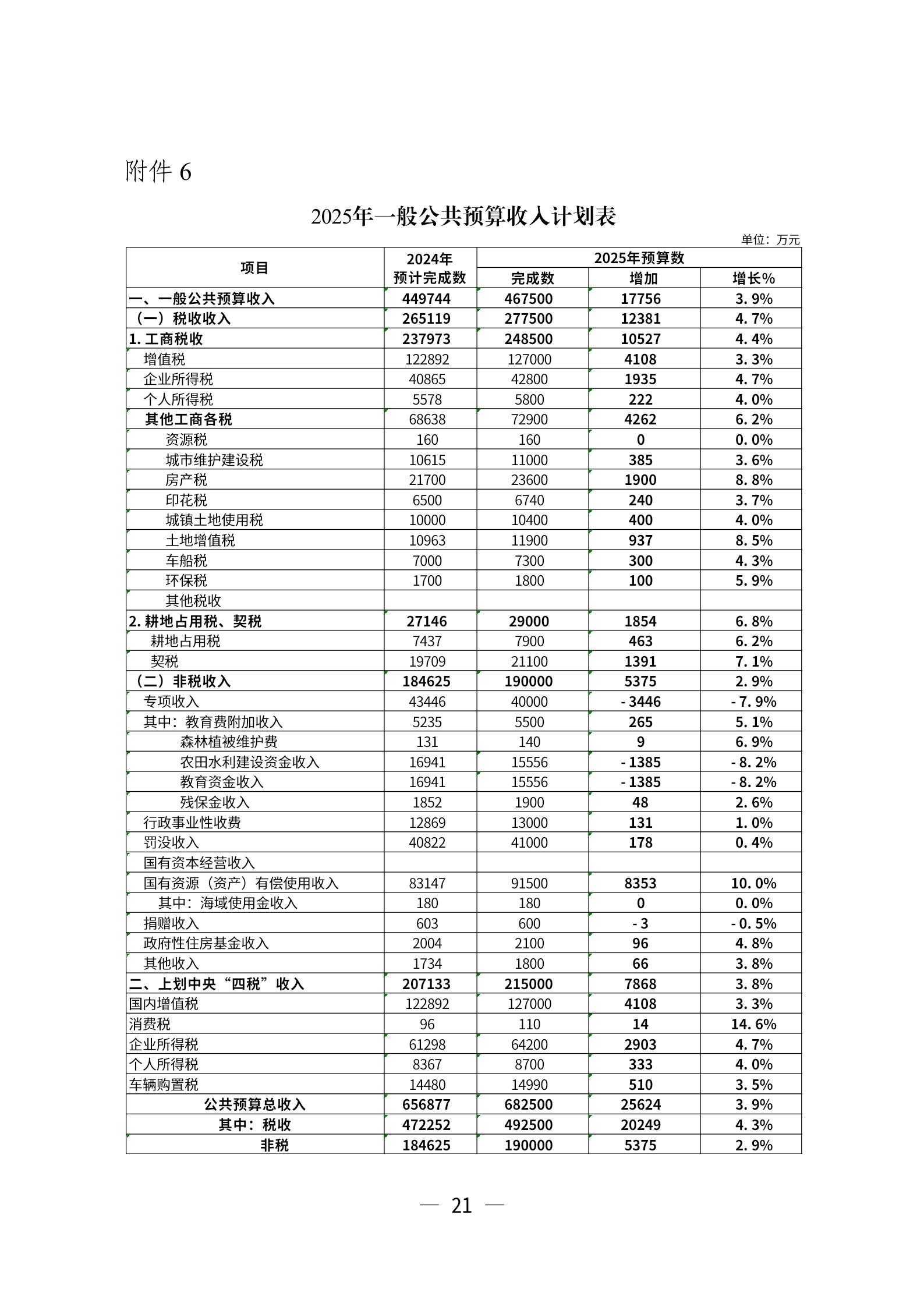 (3)平衡情况。2025年总财力52.76亿元,其中:上年结转1.94亿元;上级专项补助1.68亿元;本级财力49.14亿元,主要为:一般公共预算收入46.75亿元、返还性收入2.39亿元、一般转移性收入1.62亿元、地方政府债券收入2.9亿元(含再融资债券2.6亿元及预安排一般债0.3亿元)、调入资金(含预算稳定调节基金等)5亿元等合计58.66亿元,扣除专项上解4.28亿元、体制上解2.01亿元、援宁支出0.18亿元、地方债券还本3.05亿元等合计9.52亿元。相应安排本级支出49.14亿元,实现收支平衡。