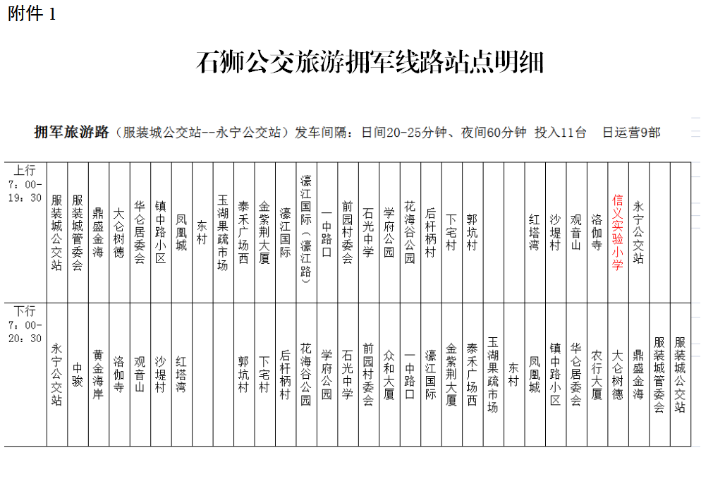 起讫点:服装城公交站-永宁公交站,途经石龙路、镇中路、宝岛路,濠江路,东港路,峡谷旅游路、石永二路、红塔湾旅游路,全里程约26公里,日间20-25分钟/班,增加夜间4个班次,夜间60分钟/班。投入车辆11台车辆,日运行9台。