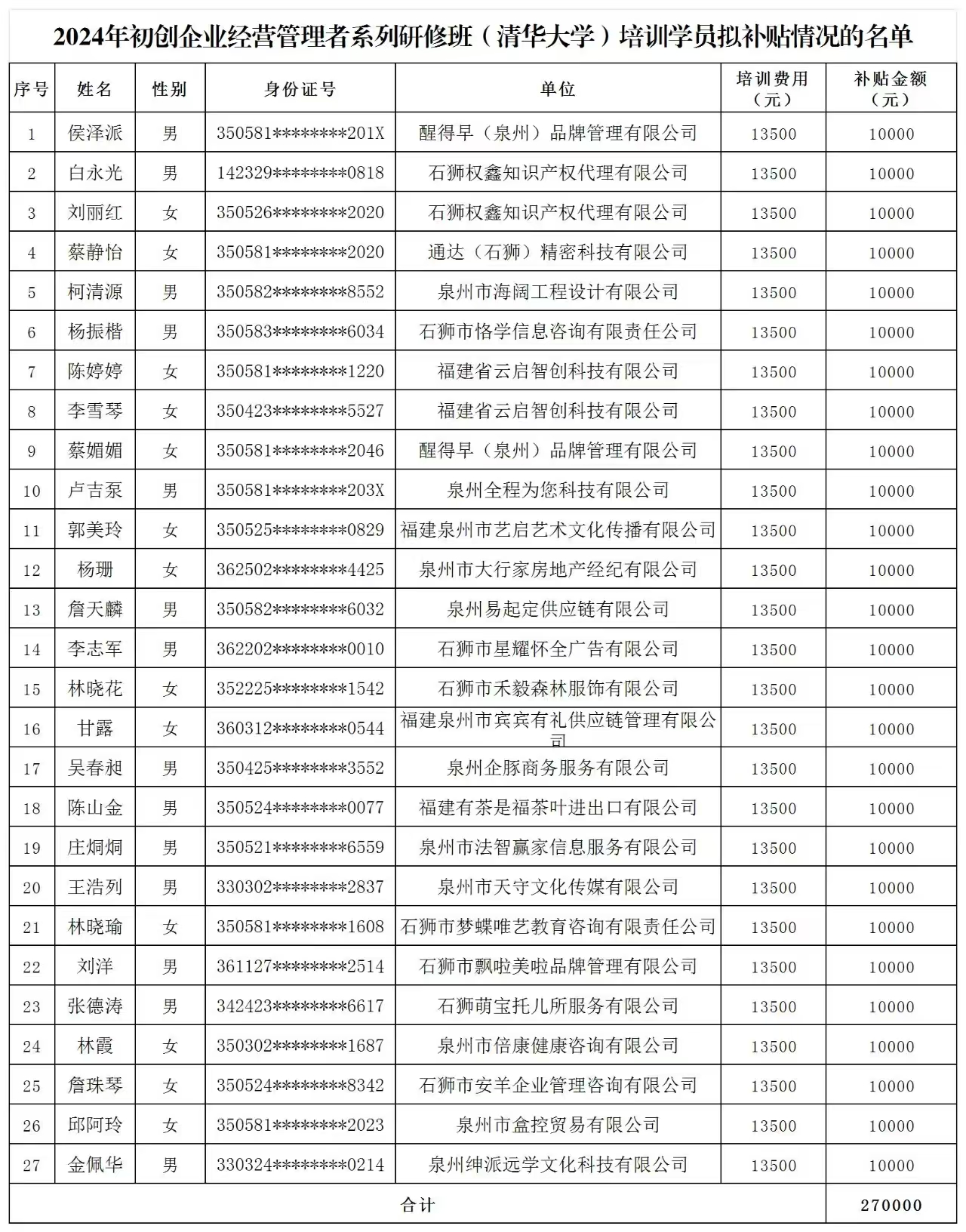 经审核,侯泽派、白永光等27人已完成2024年初创企业经营管理者研修班(清华大学)培训课程(名单详见附件),每人实际发生培训费用13500元,拟根据实际支付培训费用80%(不超过10000元)的标准,按每人10000元标准发放补贴,总金额270000元。现予以公示。
