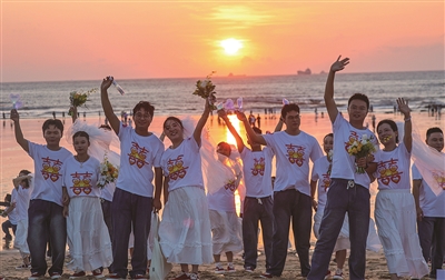 山川为盟,以海为证,沐光立誓。10月7日,新人们手提红灯笼,先行在宝盖山“吾山有喜”打卡点,完成庄重的“山盟”仪式,许下终身幸福。10月8日黎明前夕,新人们齐聚红塔湾“追光沙滩”,在歌声与海浪的伴奏中,等待第一缕晨光。当日出东方,霞光万道之时,新郎们集体单膝跪地,向身边的新娘献上象征爱与承诺的捧花。随后,全体新人手挽手拍摄心形大合照,彼此交换信物、深情拥吻,齐声许下“我愿意”的誓言,将浪漫气氛推向高潮。