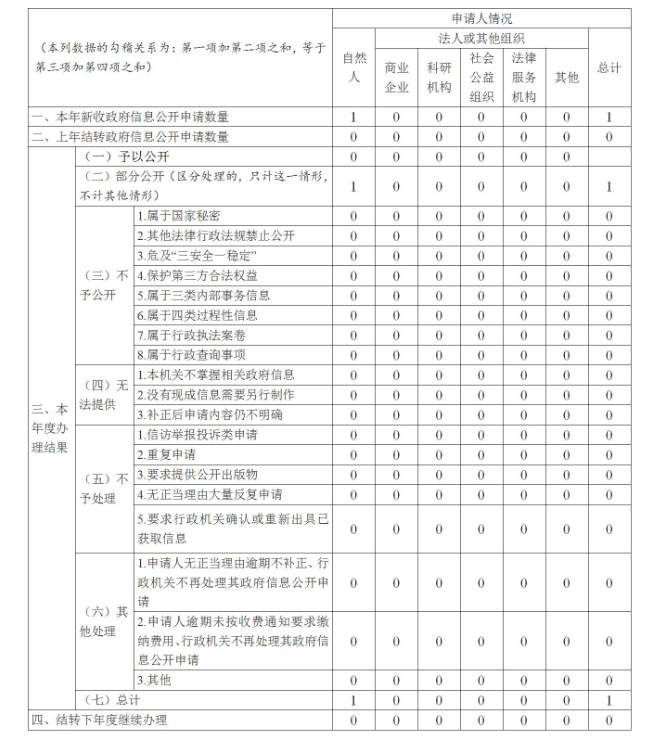 2023年我局共受理政府信息公开申请1件,办结率100%。受理方式为网络申请,其中:部分公开1件。