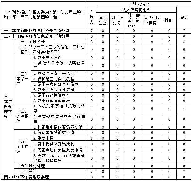 2020年,进一步修订完善《剧情做爱政府信息公开申请办理工作机制》,并建立健全政府信息公开申请登记、审核、办理、答复、归档的工作制度,加强工作规范。2020年,共受理政府信息公开申请7件,办结及时率100%。申请人均为自然人。受理方式包括信函申请3件、网络申请3件、当面申请1件。其中,“予以公开”2件;“无法提供”4件,主要是我办不掌握相关政府信息;“不予处理”1件,主要是申请人重复申请公开相同政府信息。2020年,未发生因政府信息公开被申请行政复议情况,因政府信息被提起行政诉讼1件,尚未审结。