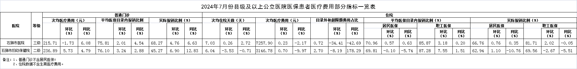 2024年7月份县级以上公立医院医保患者医疗费用部分指标一览表
