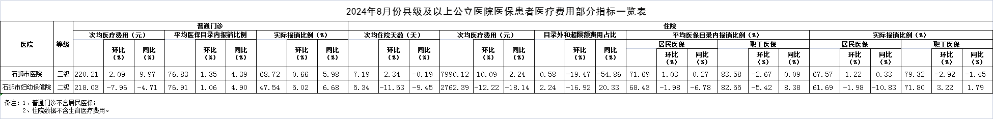 2024年8月份县级以上公立医院医保患者医疗费用部分指标一览表