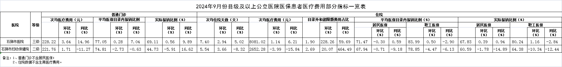 2024年9月份县级以上公立医院医保患者医疗费用部分指标一览表